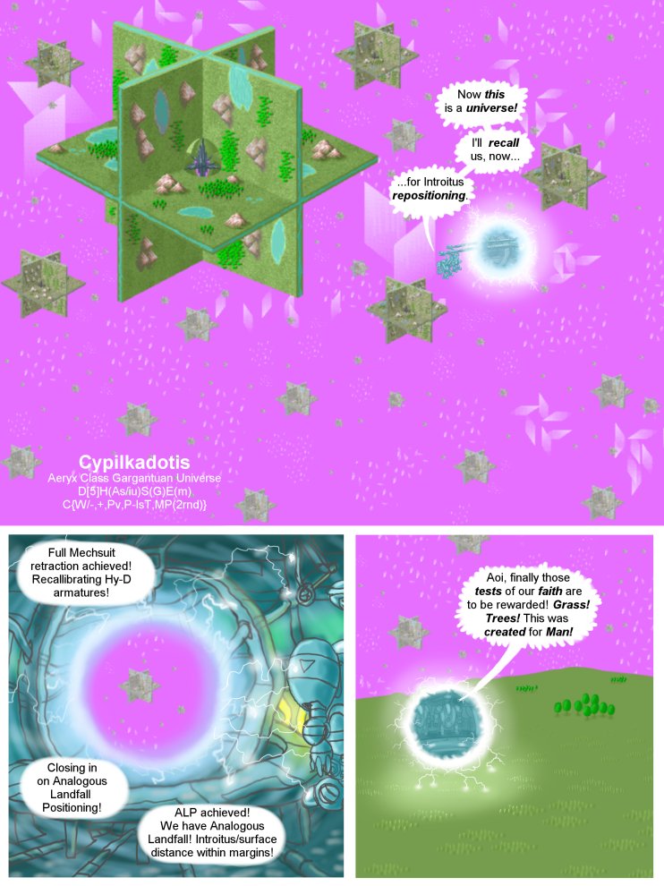 PAGE FOOTNOTES: The relative position of the dimensional introitus can be moved and repositioned by twisting and altering the angles of the hyperdimensional armatures, as well as setting the depth of their penetration. This is also how new universes are found as well, it is all a matter of degree.